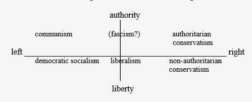 Another way of representing the extremes departs from the traditional scheme and introduces a vertical axis, cutting across the left-right horizontal axis. This is the above-mentioned bi-dimensional representation that was popularized through the Political Compass tests. The second axis was first introduced by Hans Eysenk (1954), a political psychologist, to distinguish between democratic or liberty-inclined views, and authoritarian or authority inclined views. On this basis, one can place both democratic and non-democratic ideological outlooks in the same diagram, as follows: